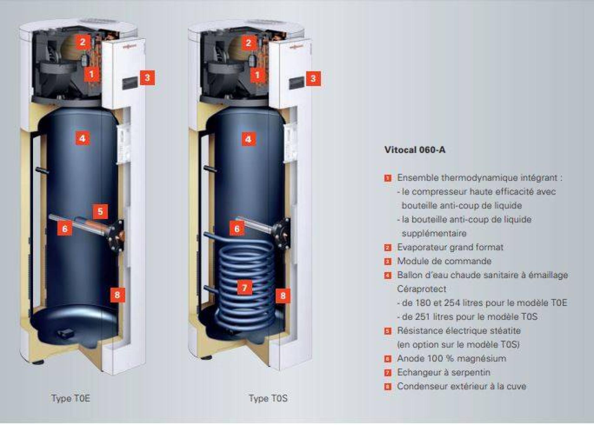 Le ballon thermodynamique Vitocal 060-A est la nouvelle solution avantageuse, unique en son genre, pour la préparation de l’eau chaude sanitaire. Il utilise une pompe à chaleur qui prélève les calories contenues dans l’air pour les transformer en chaleur vers l’eau chaude stockée dans le ballon sanitaire.