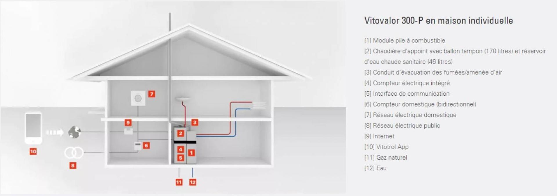 Profitez de ces avantages : Production décentralisée d’électricité couvrant vos besoins de base, au prix du gaz naturel Installation facile et temps de montage réduit : comparables à ceux d’une chaudière compacte à condensation Compacité et encombrement réduit : surface d’installation de 0,65 m2 seulement Technologie d’avenir et écologique : réduction de la facture énergétique et réduction des émissions de CO2 par rapport à la production classique d’électricité et de chaleur Fonctionnement de la pile très silencieux, système sans pièce en mouvement Grand confort de commande par tablette ou smartphone via l’application ViCare Fonctionnement possible au gaz H ou L Solution innovante conforme à la loi de la Transition Energétique (rendement sur énergie primaire (EP) > à 140 %) Classe d'efficacité énergétique chauffage : A++ Classe d'efficacité énergétique production d'eau chaude sanitaire : A+